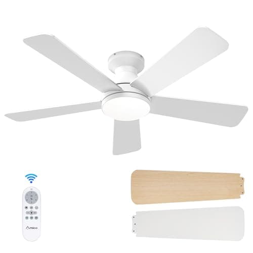 Amico Ceiling Fans with Lights, 42 Inch Low Profile Ceiling Fan with Light and Remote Control, Flush Mount, Reversible, 3CCT, Dimmable, Quiet, White Small Ceiling Fan for Bedroom Outdoor/Indoor Use